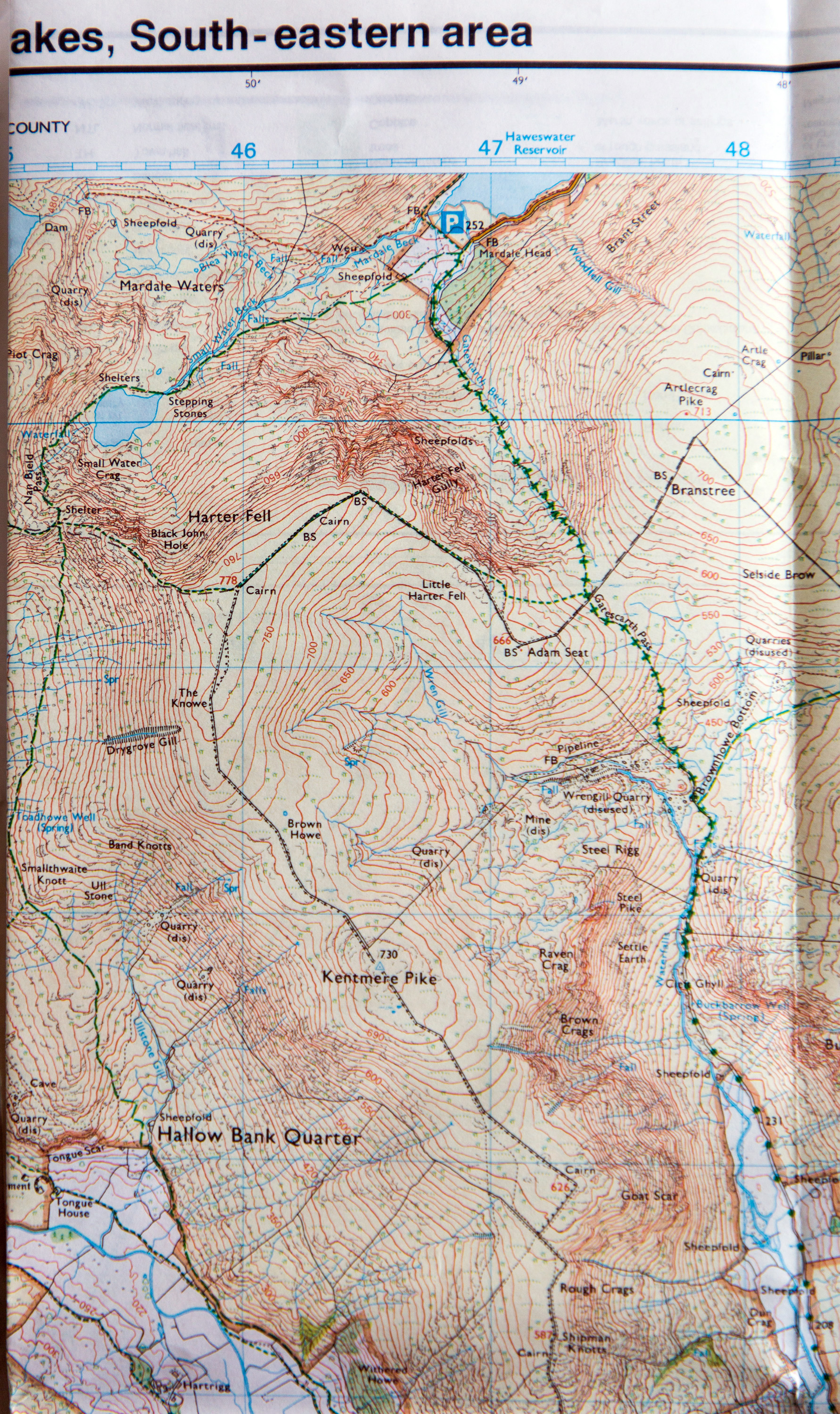 The route we took for our walk started from the car park at the southern end of Hawes Water as shown at the top of the map above. From there, we walked along the route shown by the green marking by Mardale Head, following Gatescarth Pass until we reached almost to the junction of the path entitled Brownhowe Bottom. This involved a climb of about 500 metres in vertical height along a very stony path. |