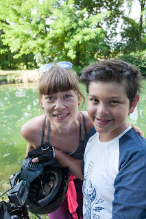 Day Seventeen: Friday 12 August 2016 At Brigitte's holiday home in the Vosges Mountains We were picked up by Brigitte in her car quite late in the evening after she'd had problems communicating with us because of her telephone not working properly. Instead of going to Frieburg, as expected, we were driven quite a long way into the Vosges Mountains where the family has a holiday home with a magnificent view. We met Brigitte's family who entertained us with an outdoor meal by candle-light and an open log fire in the garden. JP really got into toasting marshmallow's, which he'd never done before. It was great to sleep on a mattress again! No more pain from my aged hips which I always get when sleeping on the ground. Brigitte's beautiful holiday home had some VERY low door frames and, true to form, my head made contact with one of them. It really was a terrible blow. This morning we were treated to fresh French bread and a super breakfast, followed by a wonderful rendition of 'The Swan' from Saint-Saens 'Carnival of the Animals. I should explain here that Brigitte and her husband, Nick are both professional musicians. Brigitte played her magnificent grand piano accompanying Nick on his cello. I videoed the performance and it is now on our website: The Swan - by Saint Saens. Played by Brigitte and Nick Schwarting Neuf-Brisach to Colmar Brigitte took us back to Neuf-Brisach in the early afternoon. This is the French part of the area called Brisach. We had originally met her in the German part. Neuf-Brisach is a fortified town by Vauban. We spent ages looking for a bicycle shop and eventually ended up in a Tabac - to buy bicycle inner tubes! Having used both of our spares because of punctures and the failures of the patches, it was necessary to buy more spares as riding in some of the remoter areas, where we are prone to punctures, would mean a long walk if we had more punctures with no spares. I bought two Michelin tubes and off we went to the start of the ride. We would never have found the 'tube shop' without Brigitte as it was in such an obscure place and my non-existent French means that I understand very little of what people might try and tell me. We got going on our ride, much of which was though fields of maize / sweet corn or alongside the Canal du Rhone au Rhin. In the canal, we saw an Otter (we think!) scaring some Mallards. I was following JP at one point and as I caught him up I found he was chatting to a very friendly French Girl - named France.