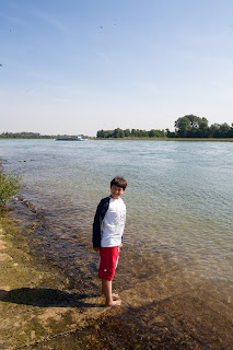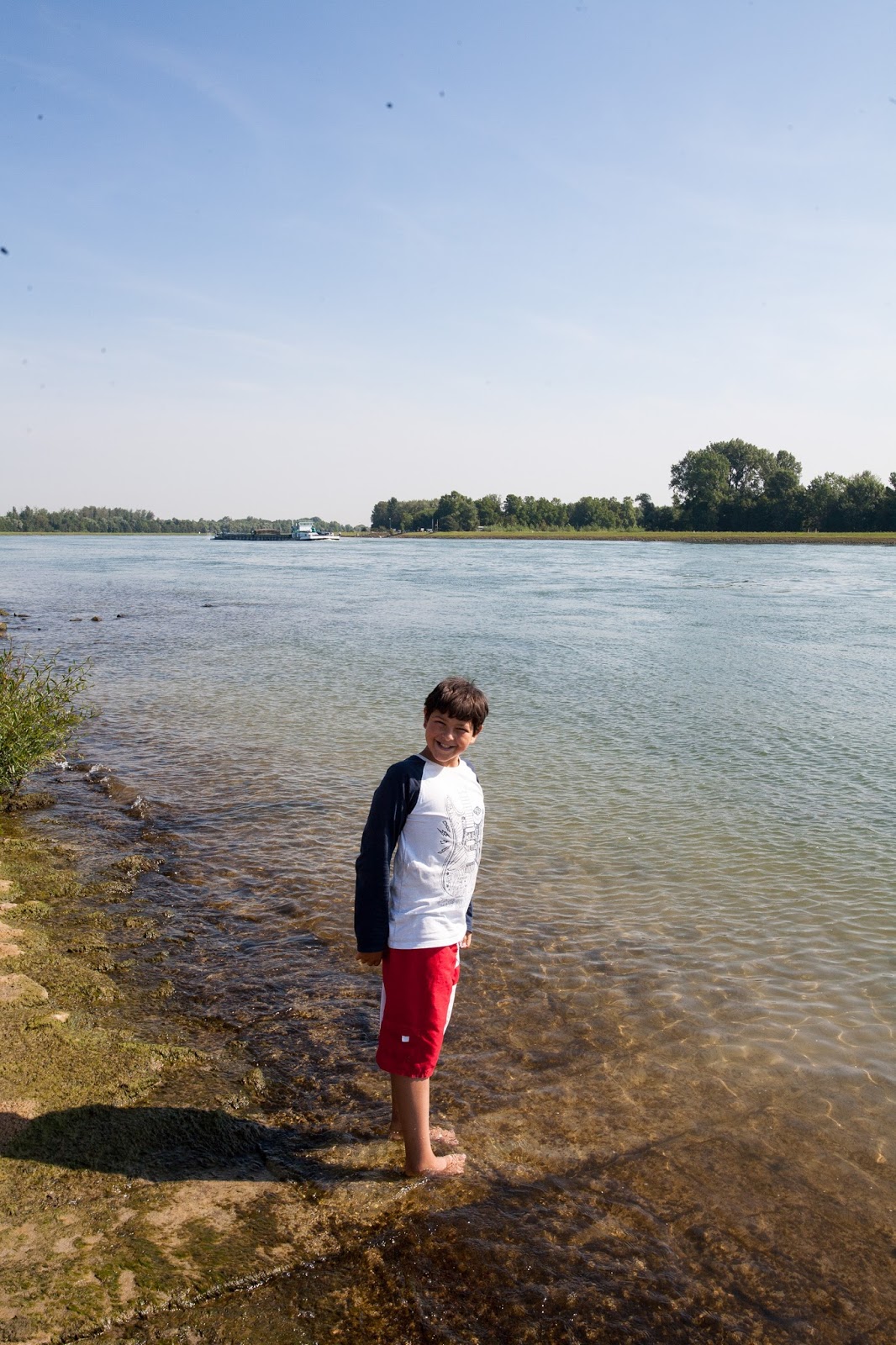 We stopped for a Pan au Chocolate and a battered banana which we carried with us. Our stopping place was by a slipway into the River Rhine where JP had a paddle. JP refused to leave the water so I got on my bicycle and pedalled off without him. That got him moving!