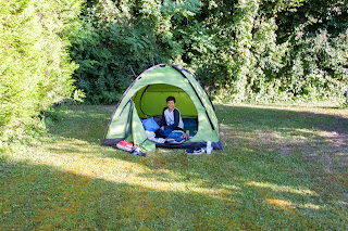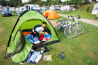 After his first swim, JP returned and I sent him off for more ice lollies. Later we had a meal in the campsite snack bar selling various processed meats with salad and bread; and we bought some chips too. We returned to the tent and JP headed back to the water. Can't keep him away from water for very long.