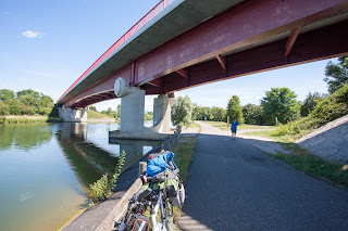 JP decided we'd hit the road instead of sightseeing in Strasbourg, so off into the unknown we went. Getting out of a city is always more difficult than getting in. After a minor error in our navigation we asked a family of cyclists for some directions, remembering that not all directions we receive are correct. We pedalled along the Route du Petit Rhin and across the bridge.
